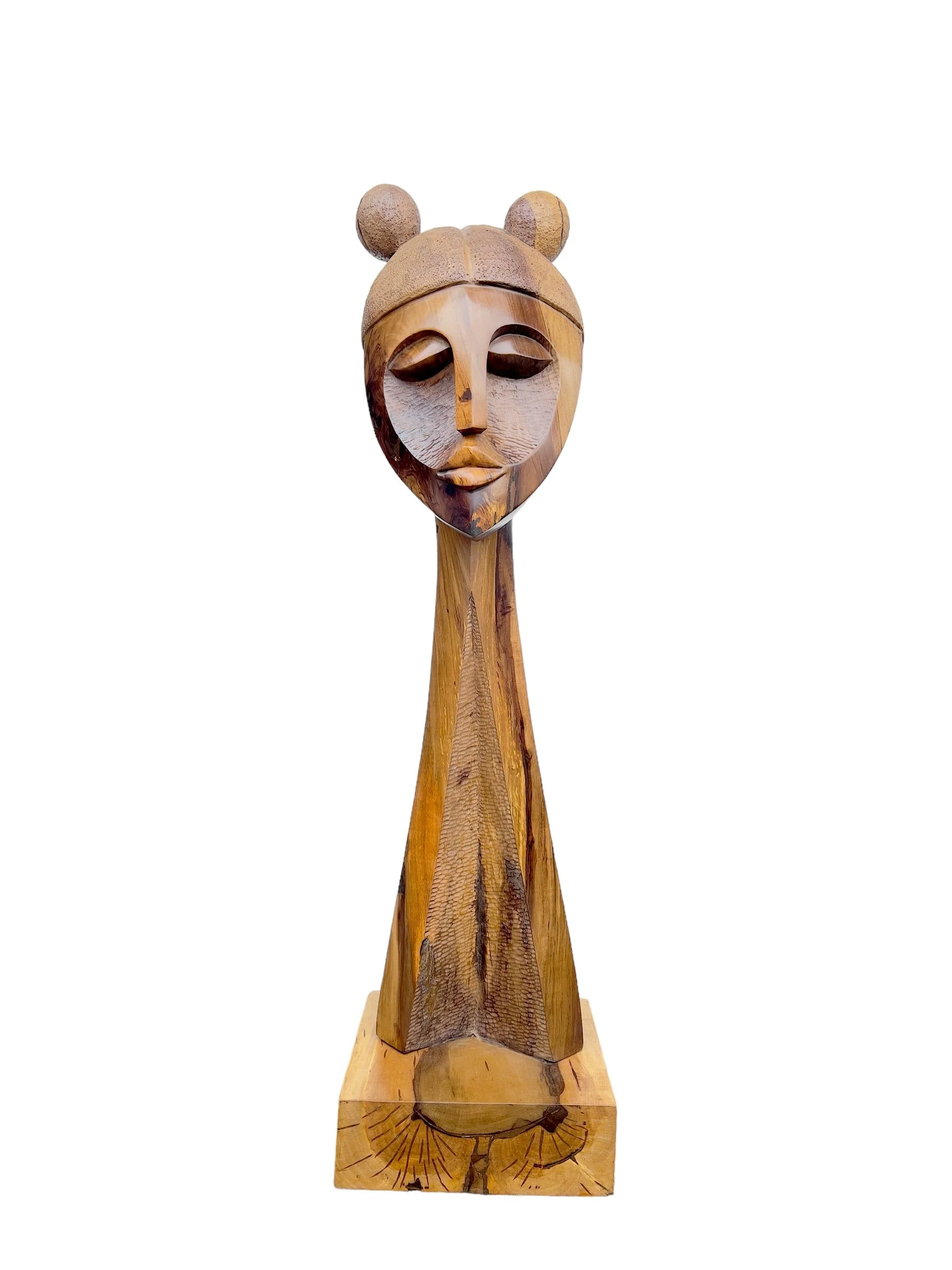 Wooden sculpture of a stylized human face with closed eyes, wearing a bear-shaped hat, mounted on a long, narrow wooden base.