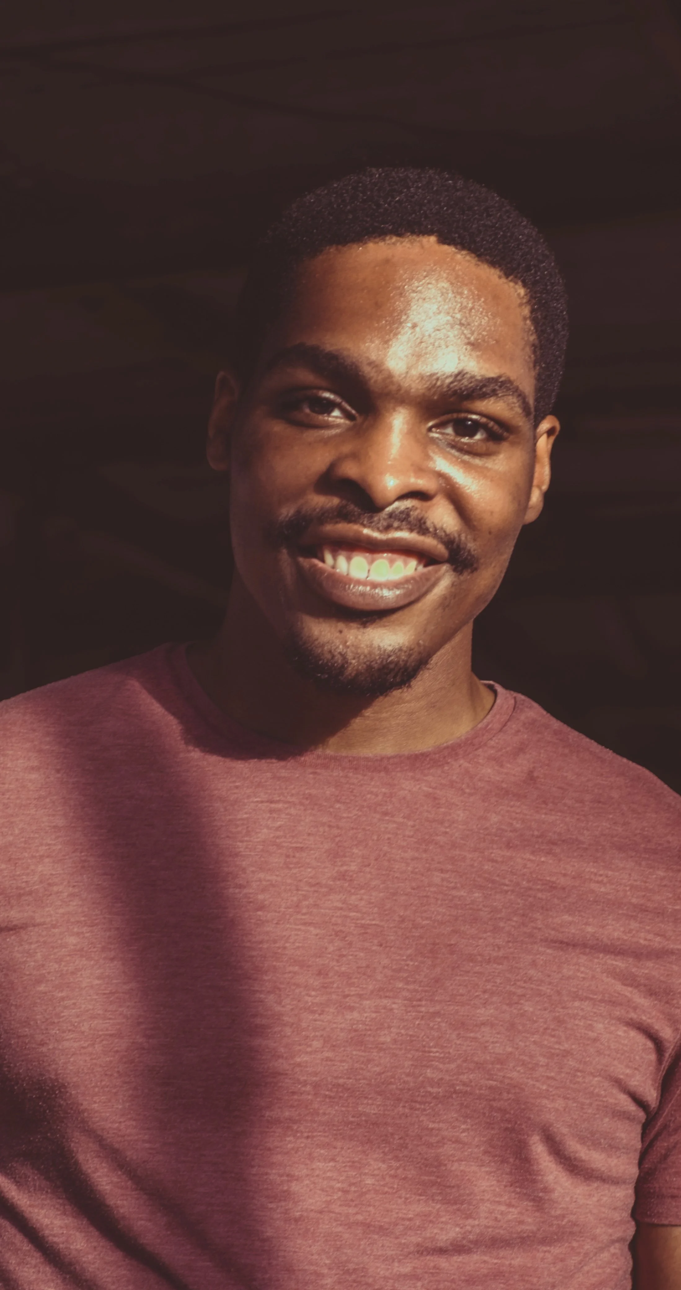 Close-up of a young man with a big smile, short curly hair, and a mustache and goatee, wearing a maroon t-shirt. This is Toluwase Olaku, the founder of Infinite Treasures African Art